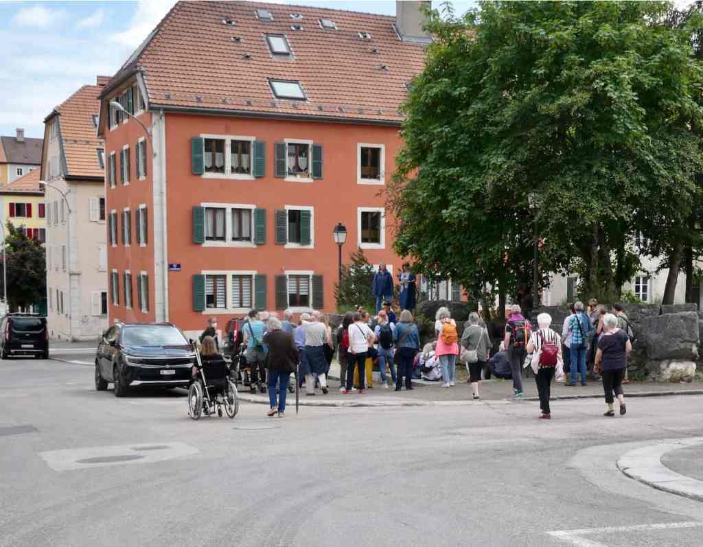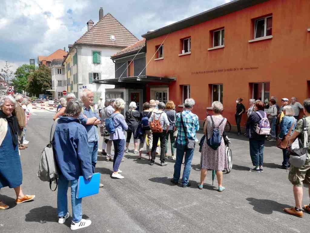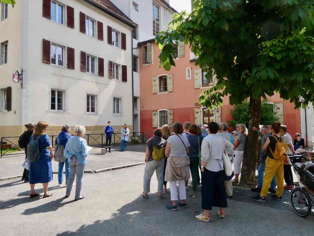 Le samedi 10 juin 2023, notre balade a emmené une soixantaine de personnes à la (re)découverte de onze phrases peintes sur les façades de la vieille ville, dans le cadre du projet Hauteur·e·s du Temps.