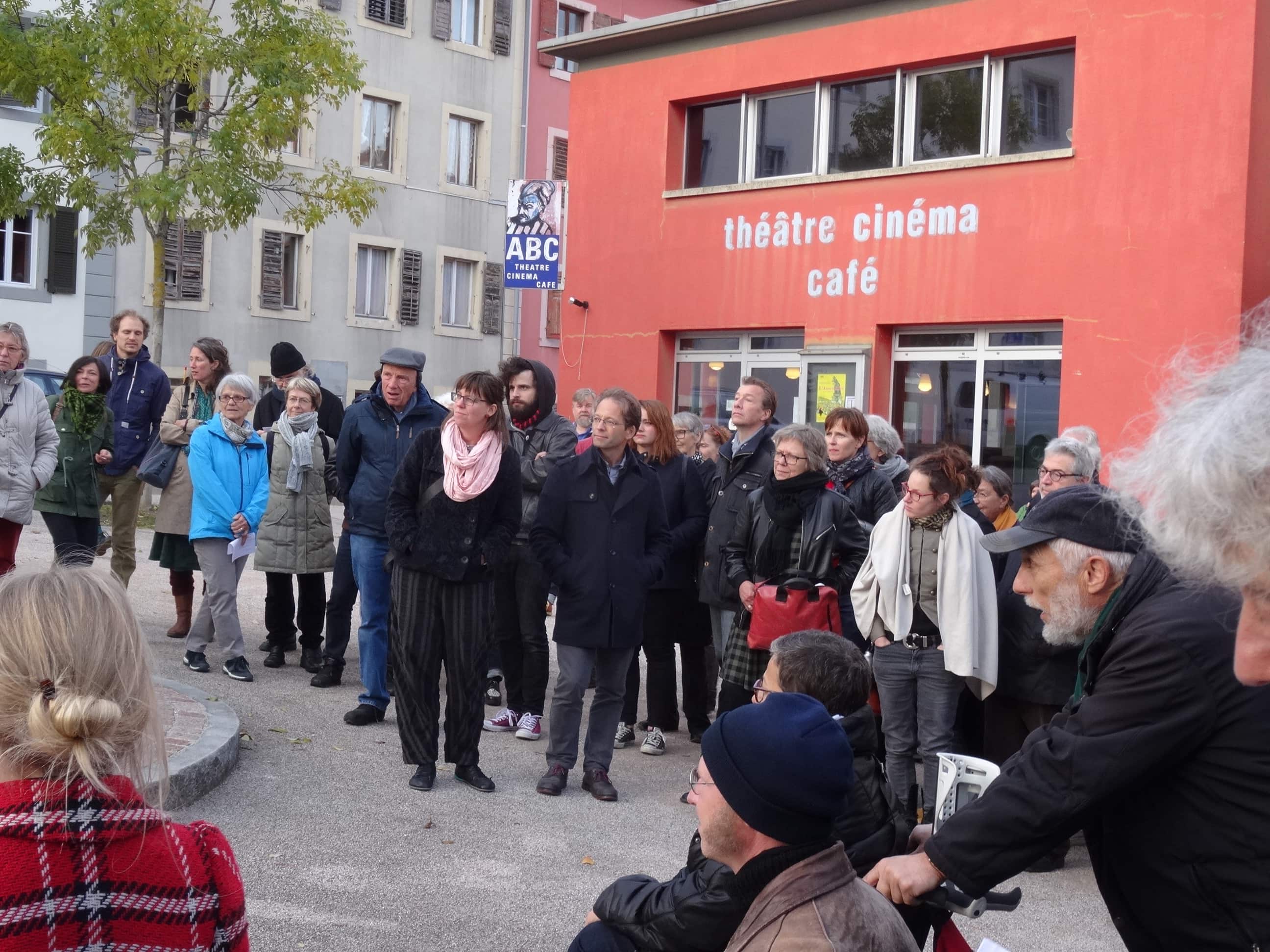 Cinquante ans après, la balade, en compagnie de comédien·ne·s et de musicien·ne·s, rappelle le parcours géographique du théâtre et cinéma ABC ainsi que les moments forts de son évolution artistique et administrative. Au détour des lieux et des rues, on se souvient des pères fondateurs, Leu, Huguenin, Gattoni; on rappelle la place de l’ABC dans le contexte local, on mesure le cheminement jusqu’au Coq et son écrin rouge; on entend des mots de théâtre et des notes de musique, bien sûr, repris par les artistes qui ont contribué à la magie des lieux.